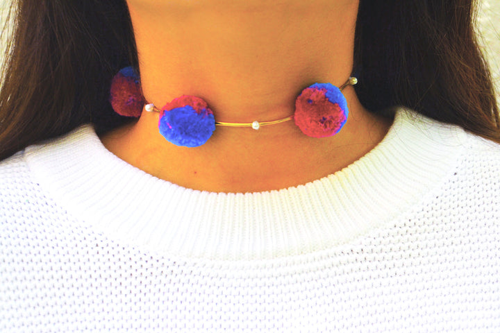 Our latest favourite! Handmade fuschia/blue pom pom's on a Grecian sourced gold plated metal choker, accented with mini pearls.