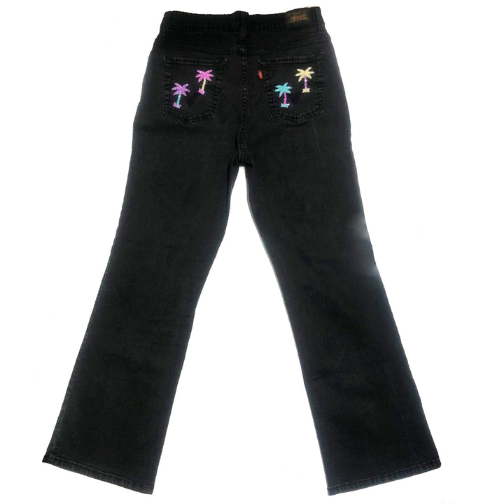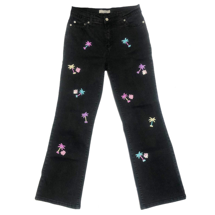 Super comfortable and durable Vintage Levis Jeans, adorned with our handmade palm trees. A simple yet adorable effect. One of a kind, and limited sizing. With a bootcut shape and lower waist.