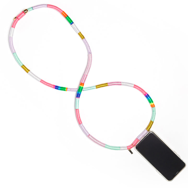 A gorgeous hand wrapped rope attached by hooks to clear phone cases. Cases come in assorted sizes from iPhone X-14. Phone rope is worn around the neck, and non adjustable.