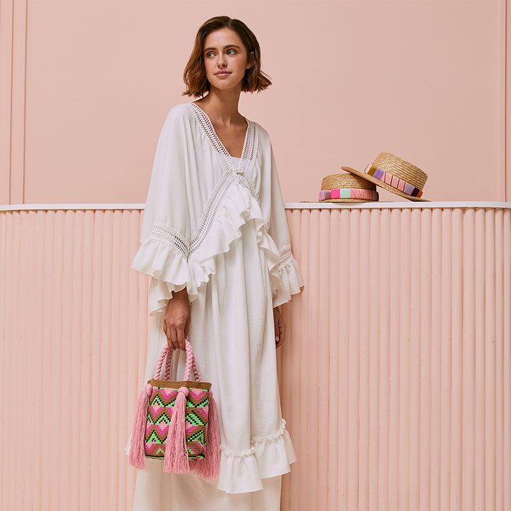 With its textural, globally inspired motif, with modern colorways, this mini bucket bag is a one-of-a-kind piece that you're sure to treasure. Perfect for those busy summer days and balmy vacations, or even the perfect carry-all handbag!