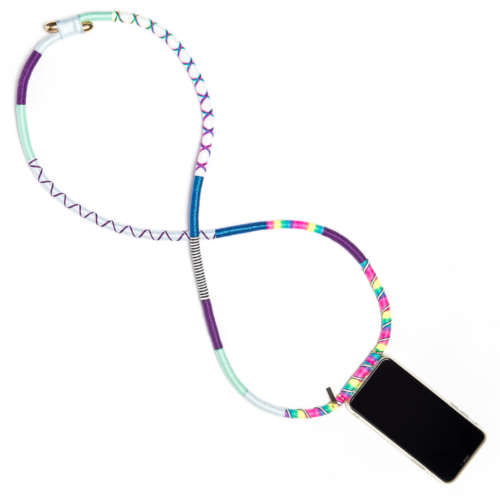 A gorgeous hand wrapped rope attached by hooks to clear phone cases. Cases come in assorted sizes from iPhone X-14. Phone rope is worn around the neck, and non adjustable.