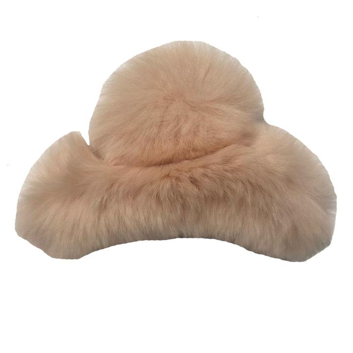 A small furry claw clip that is best suited for short or medium length hair, and works best to hold half a head of hair up.