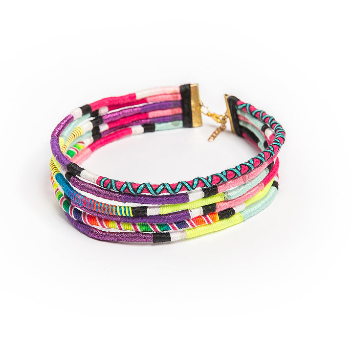One of our latest creations completely handmade in the Le Pom Pom studio. The necklace threads are wrapped on a base of sturdy rope with adjustable matching strings on the ends.
