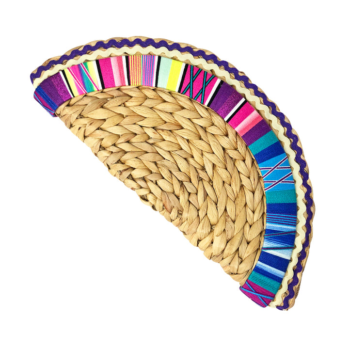 A hand made semi circle straw bag, made with rattan straw, with a zipper and a leather hand strap attached. Bag band is completely made by hand with our signature hand wrapped design pattern.